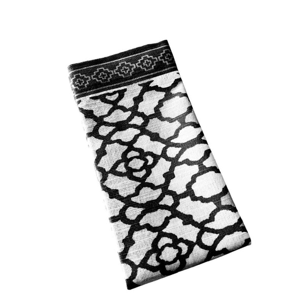 A sophisticated black napkin adorned with a floral pattern, ideal for adding elegance to dining settings.