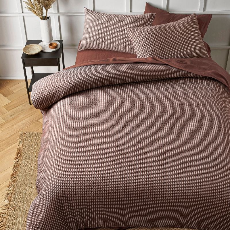 Warm up your bedroom with earthy tones and inviting texture. The Accessorize Hokey Pokey Waffle Tobacco Quilt Cover Set blends a rich, tobacco hue with a soft waffle weave, giving you a look that feels both modern and cosy.
